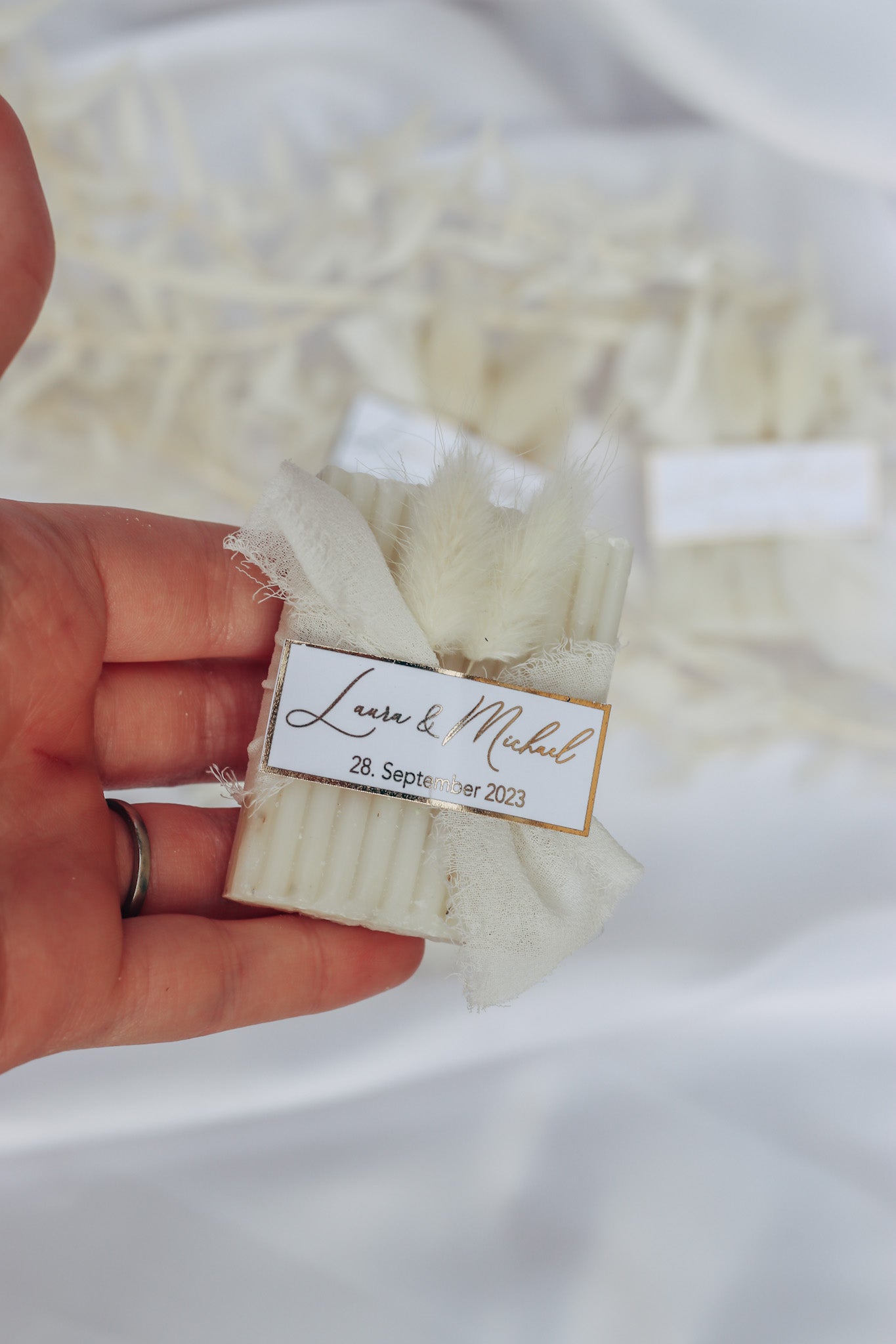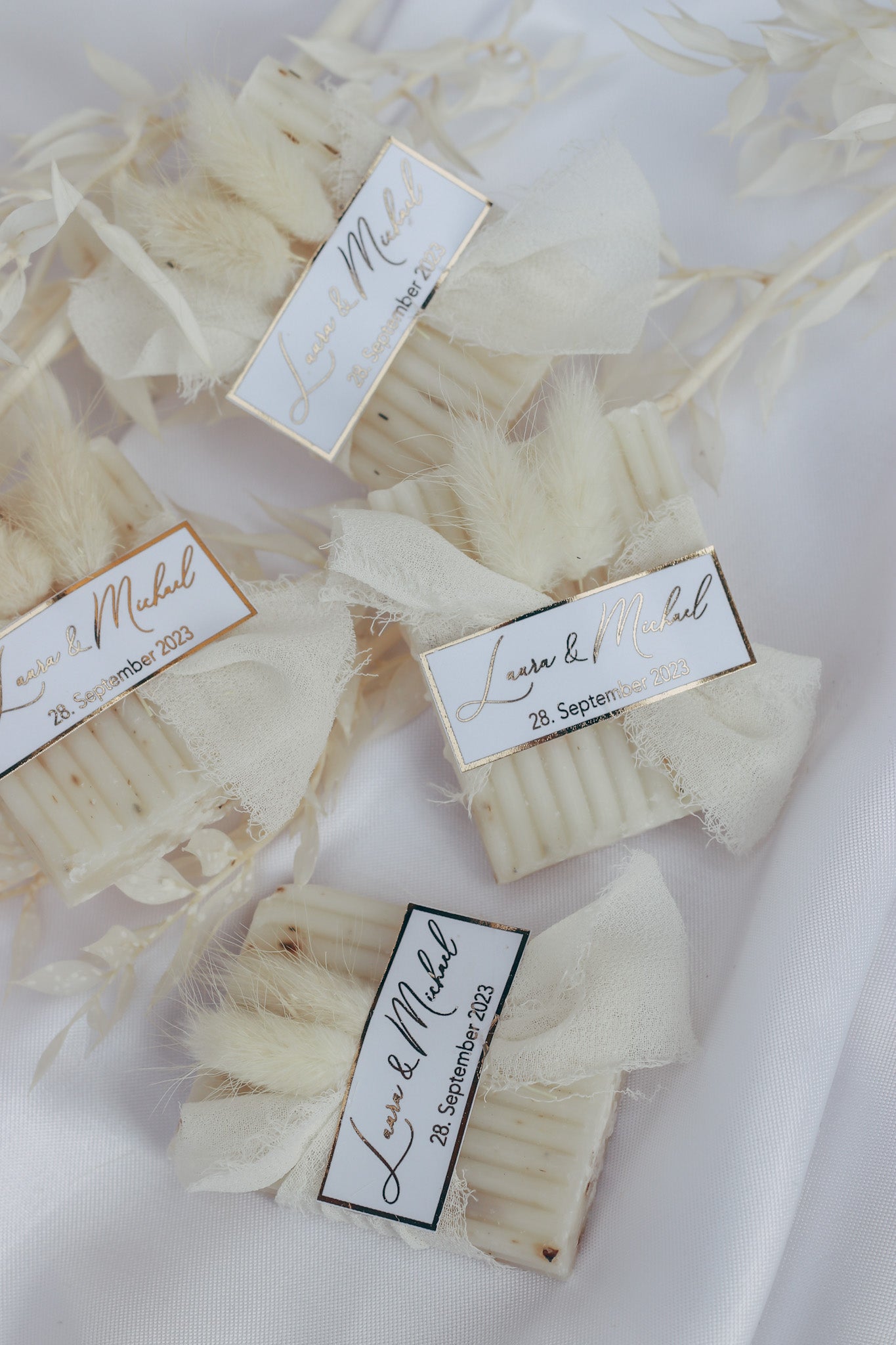 ese schönen kleinen Seifen eignen sich super als Gastgeschenk. Veredelt wird die Seife mittels Chiffonband, Lagurus (Samgras Trockenblume) und personalisiertem Etikett mit Metallic Veredelung.